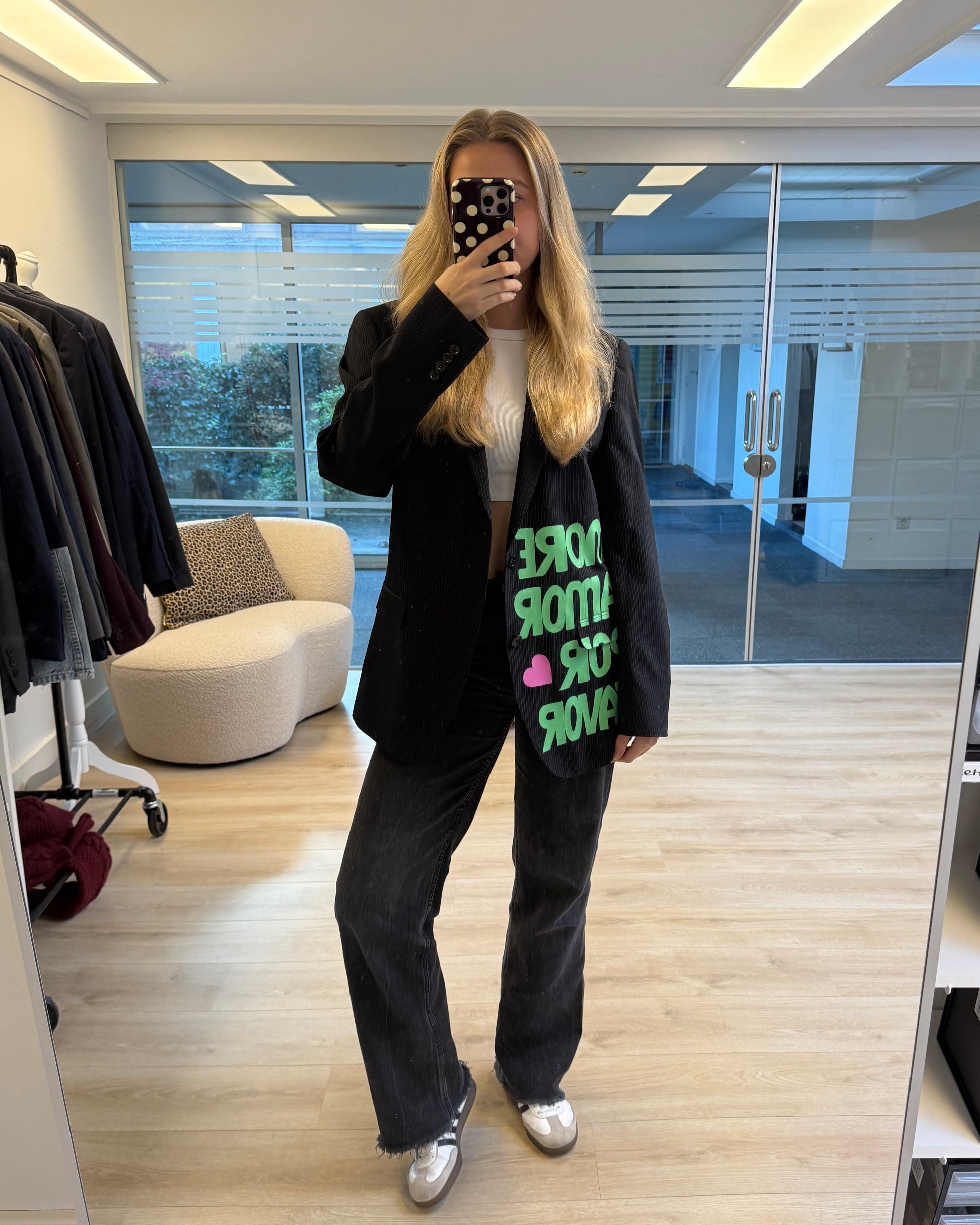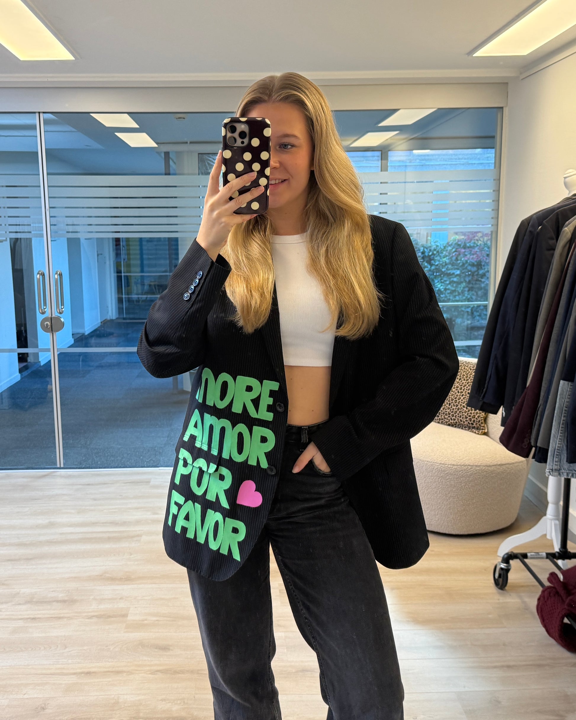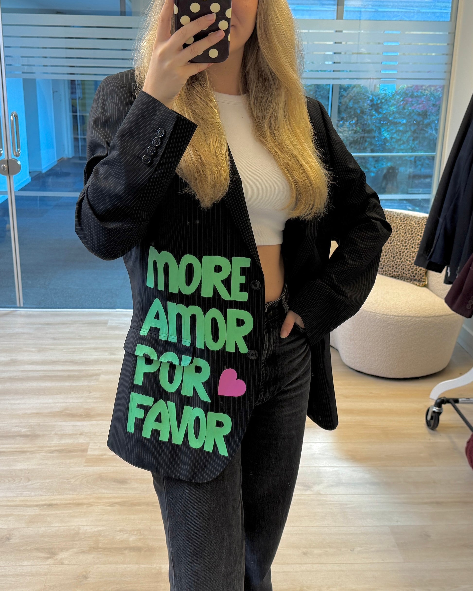 More amor por favor 💚 Deze handgeschilderde blazer is echt een statement piece. Elke blazer is gemaakt van een vintage exemplaar en met de hand voorzien van unieke details — er is dus van elke maar één! Perfect voor wie houdt van een opvallende, creatieve look. De pasvorm is oversized, dus check dat even goed bij het kiezen van je maat 💗