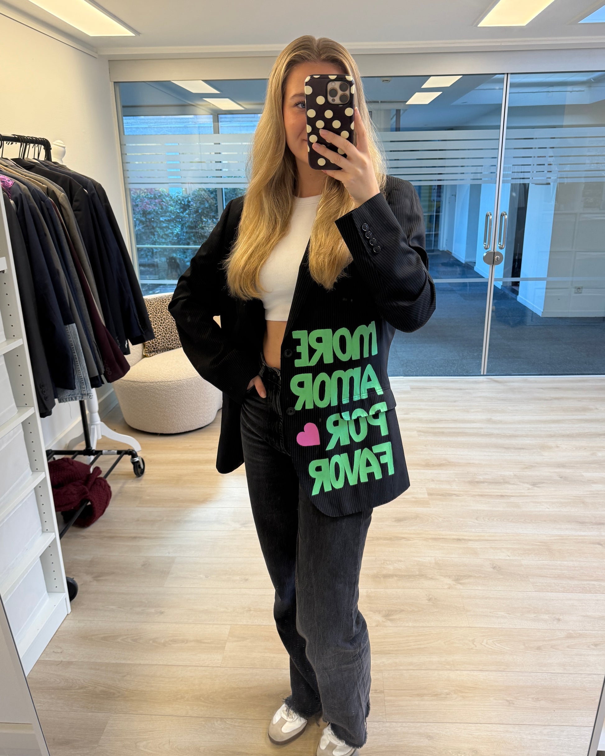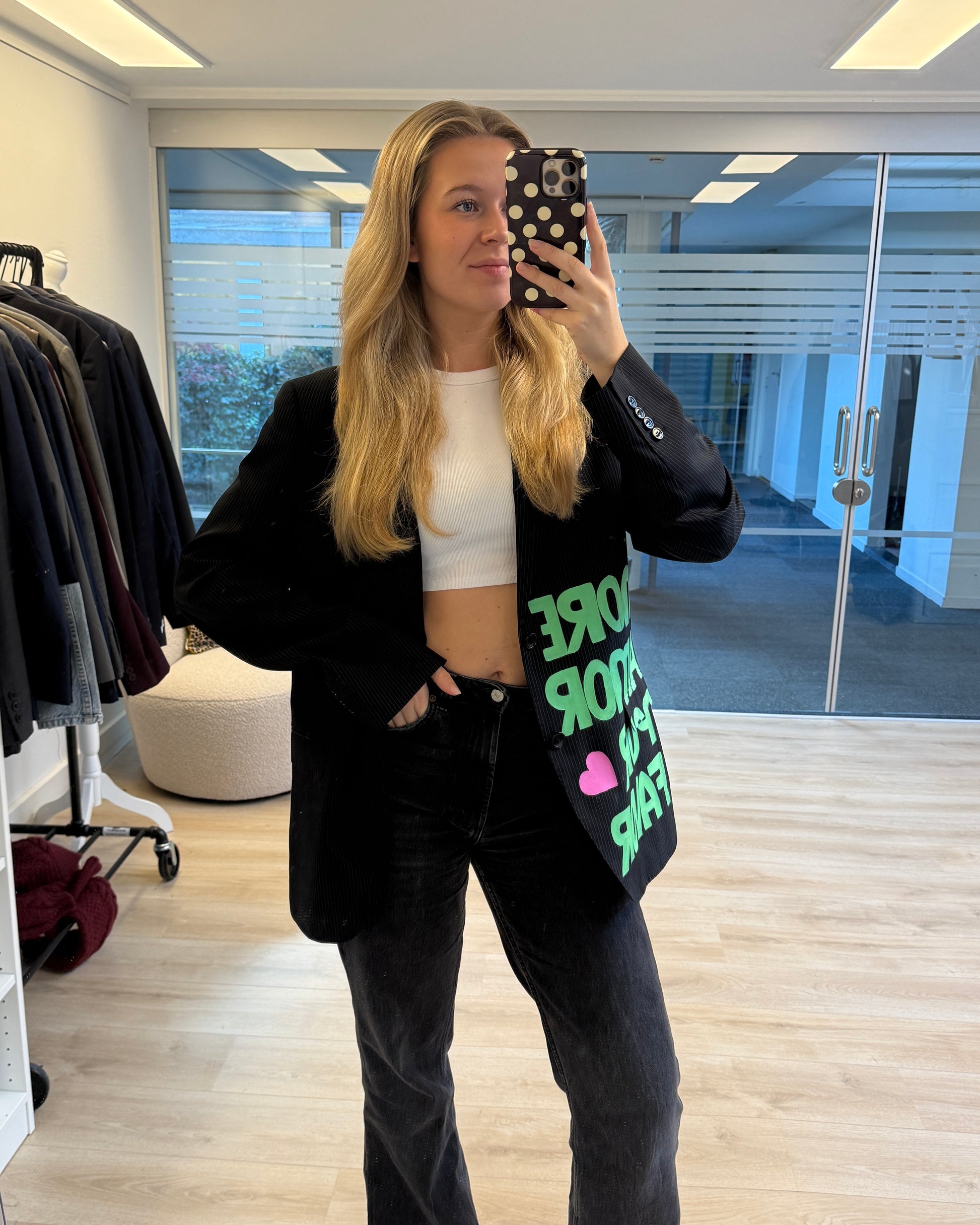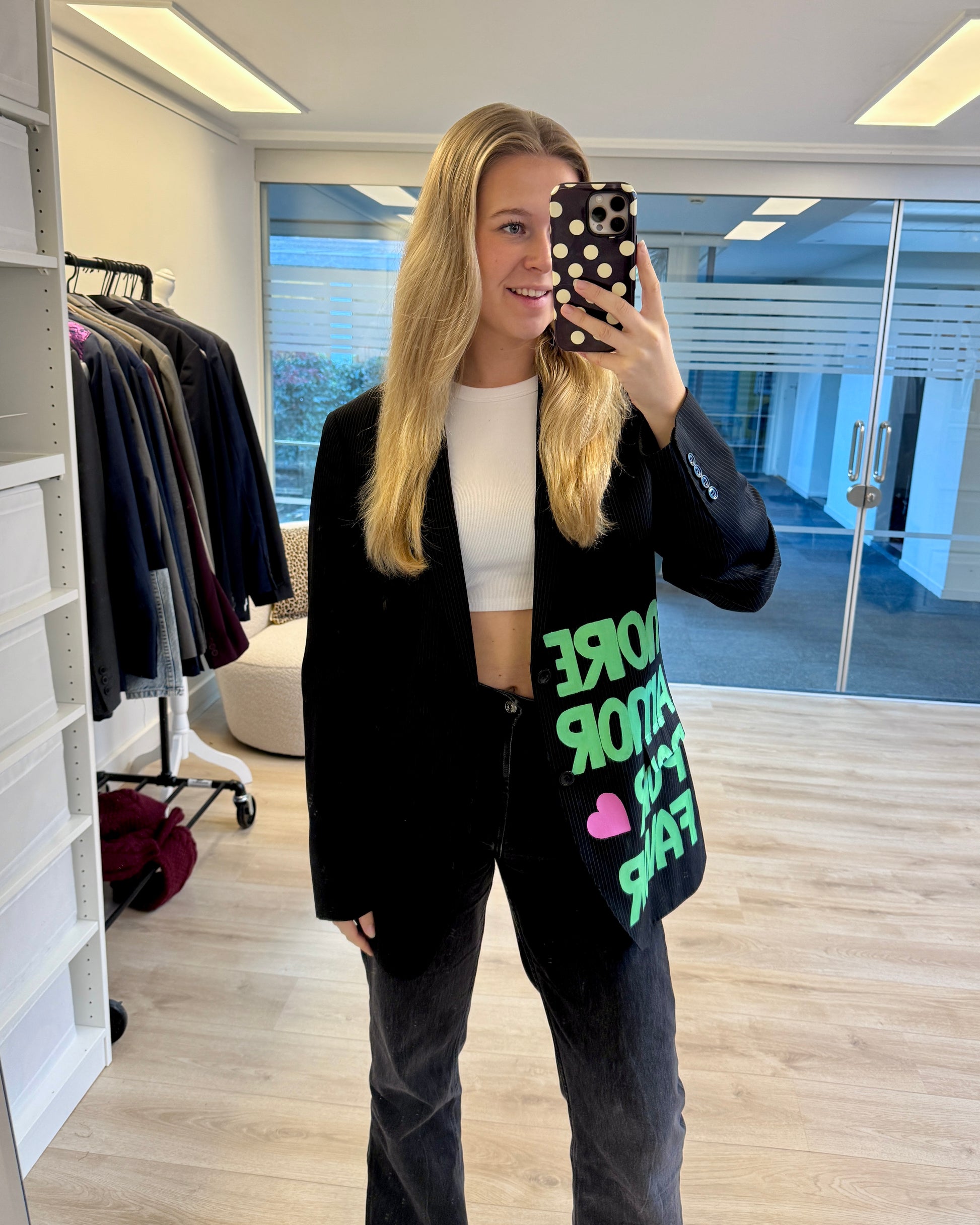 More amor por favor 💚 Deze handgeschilderde blazer is echt een statement piece. Elke blazer is gemaakt van een vintage exemplaar en met de hand voorzien van unieke details — er is dus van elke maar één! Perfect voor wie houdt van een opvallende, creatieve look. De pasvorm is oversized, dus check dat even goed bij het kiezen van je maat 💗