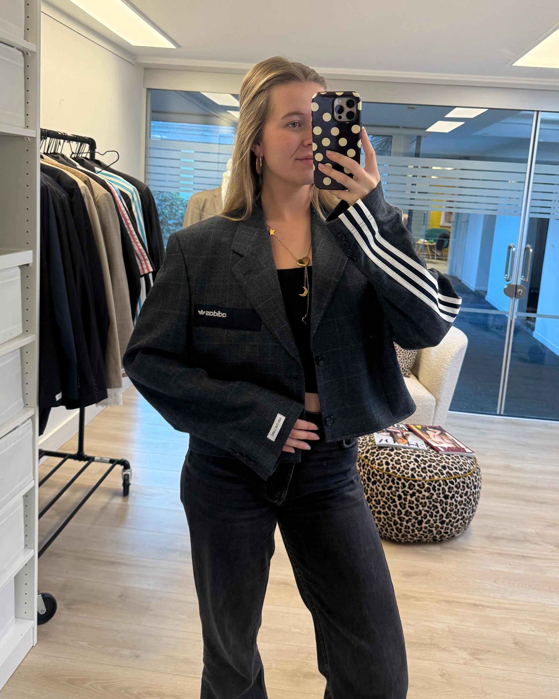 De blazers kunnen van maat XS t/m L. Heb je een maat L zal de blazer iets kleiner vallen dan het model en heb je een maat XS juist iets groter dan het model.