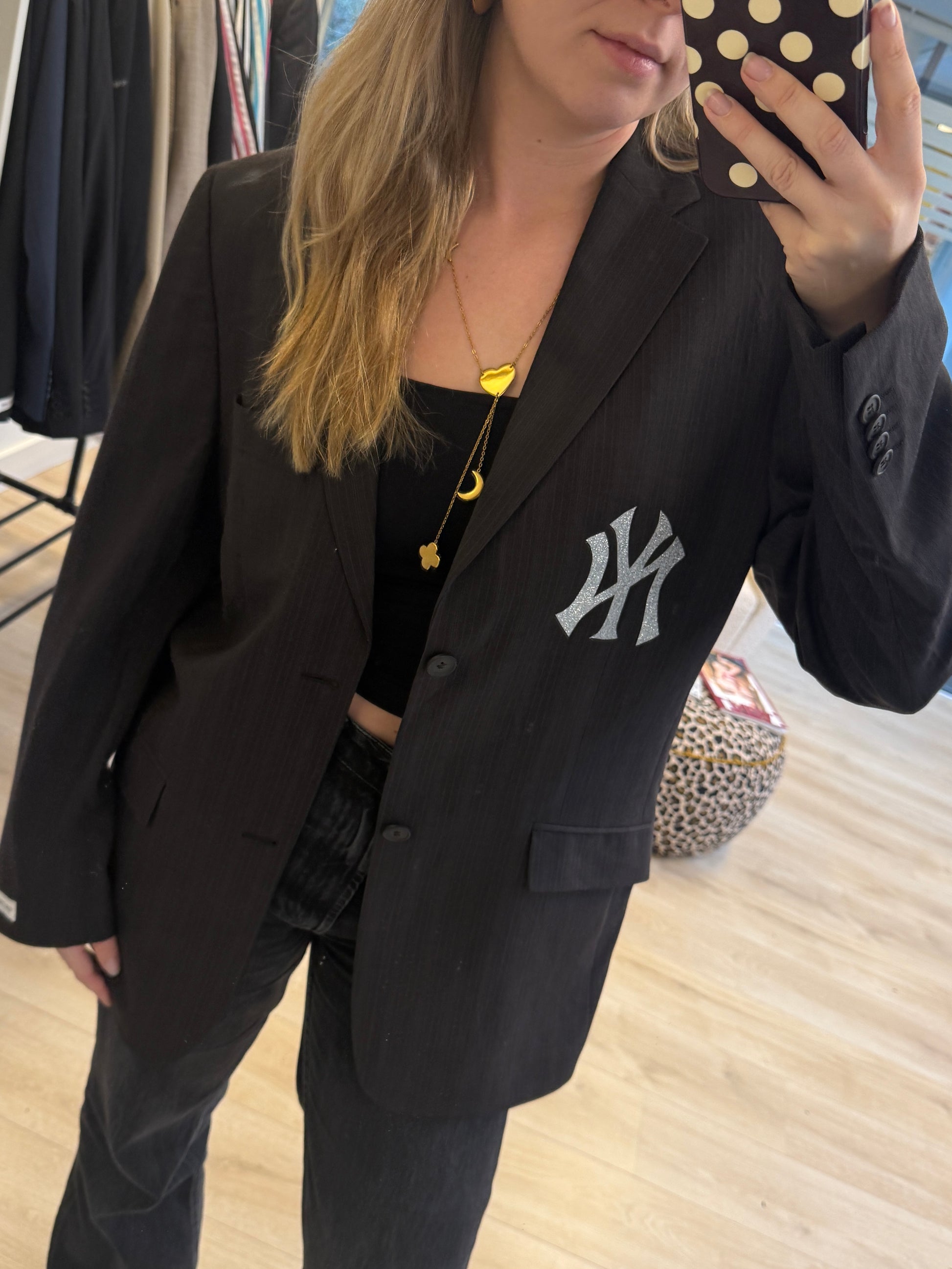 Deze blazer is een herenmaat: 52. Dit staat gelijk aan een M met een oversized fit. Wil je dat de blazer aangesloten valt neem dan een maat kleiner dan je eigen maat of als je wil dat de blazer echt mega oversized valt neem dan een maat groter dan je eigen maat! Kijk voor afmetingen tussen de foto's