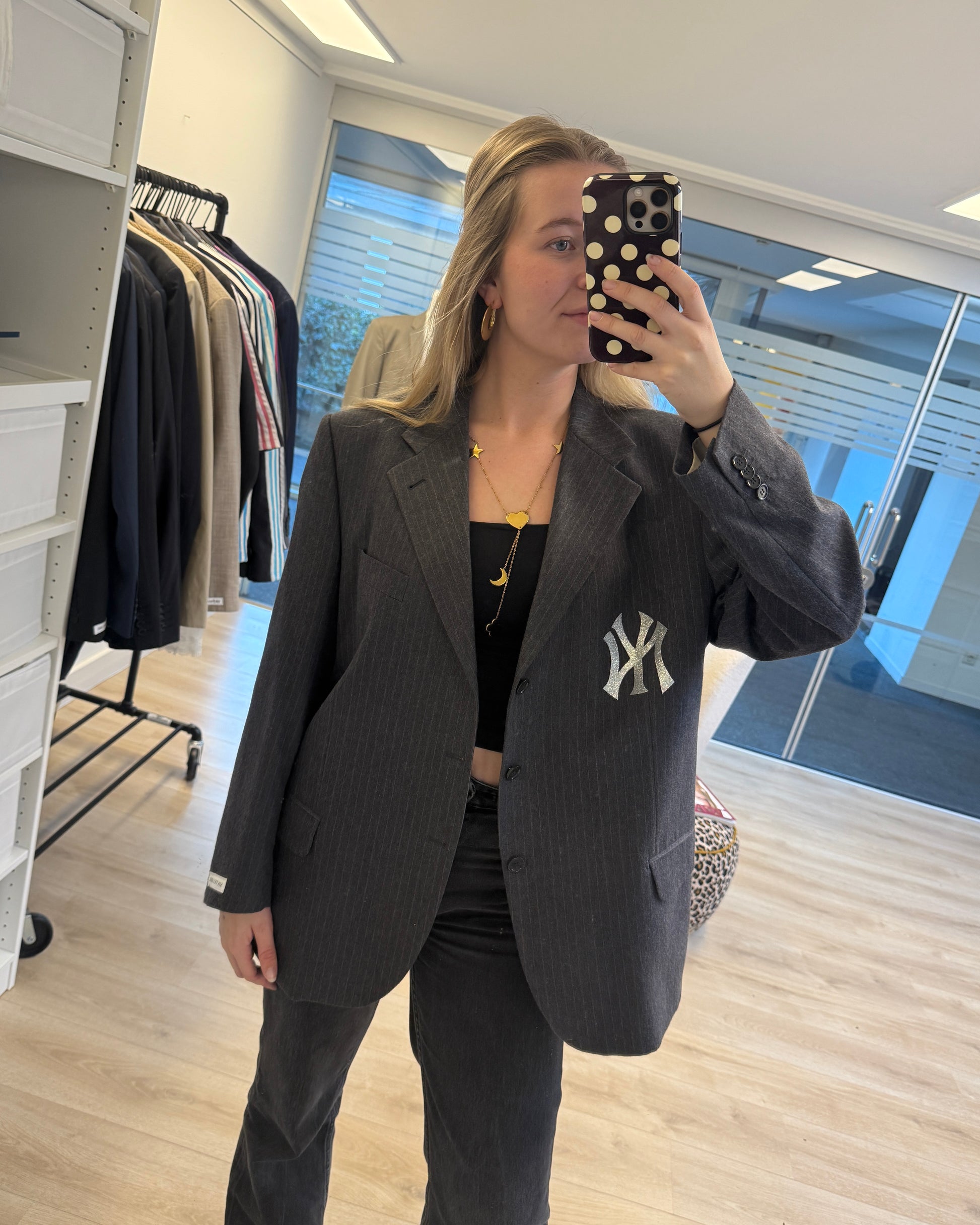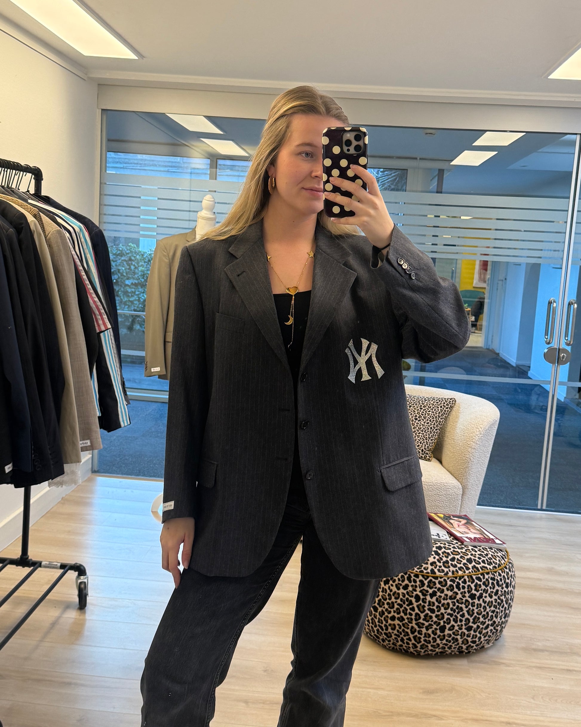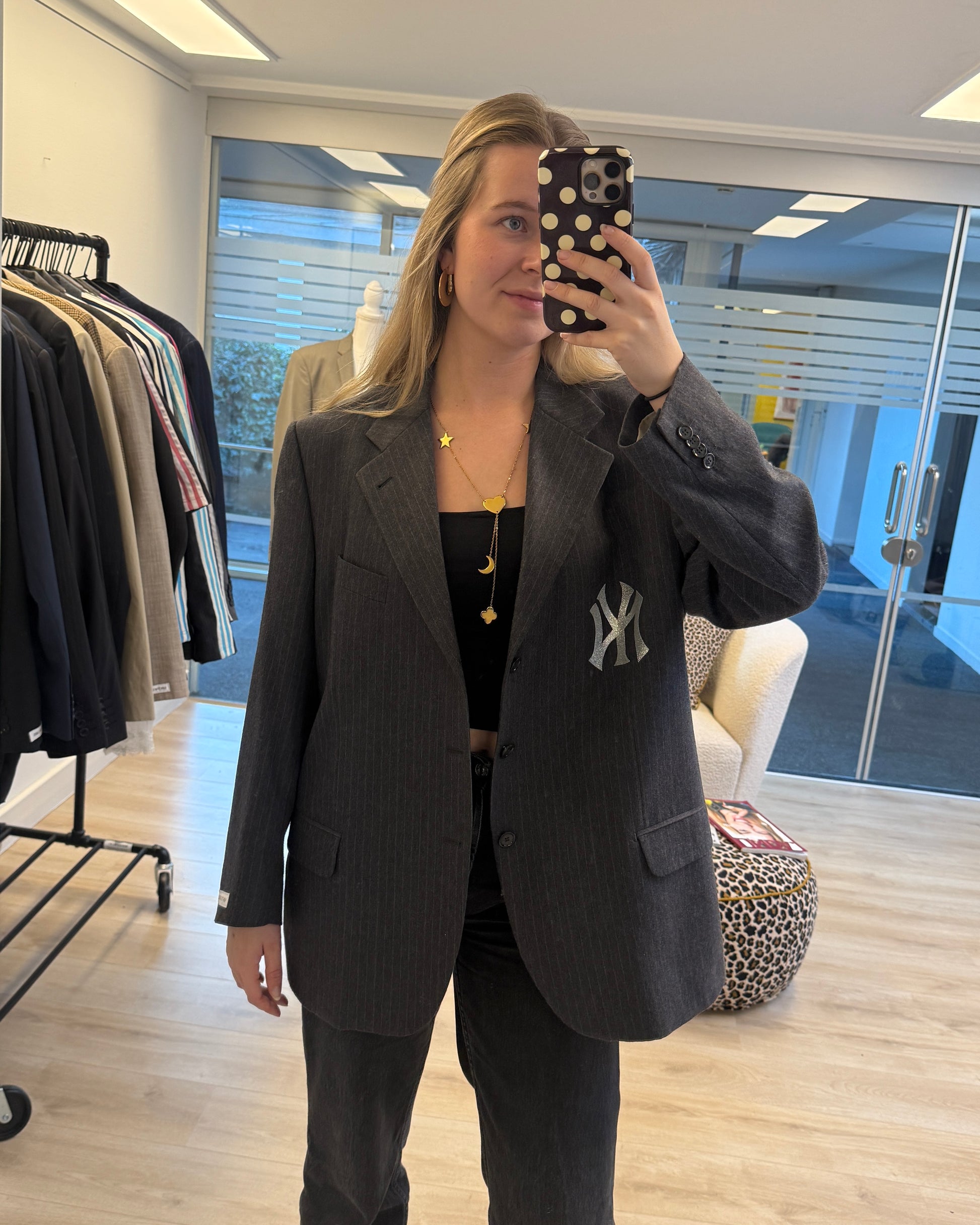 Deze blazer is een herenmaat: 54. Dit staat gelijk aan een M/L met een oversized fit. Wil je dat de blazer aangesloten valt neem dan een maat kleiner dan je eigen maat of als je wil dat de blazer echt mega oversized valt neem dan een maat groter dan je eigen maat! Kijk voor afmetingen tussen de foto's