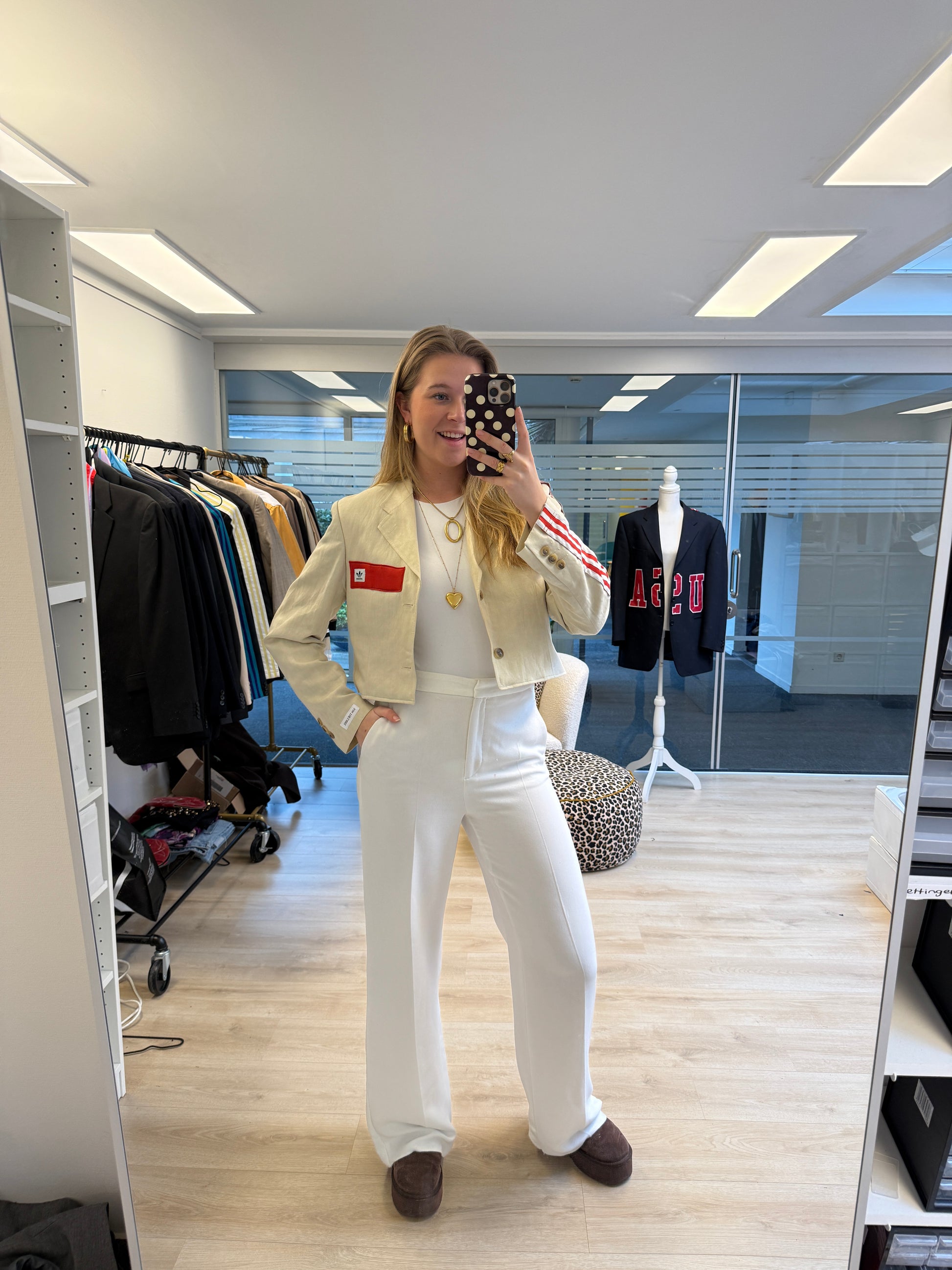 De blazers kunnen van maat XS t/m L. Heb je een maat L zal de blazer iets kleiner vallen dan het model en heb je een maat XS juist iets groter dan het model.