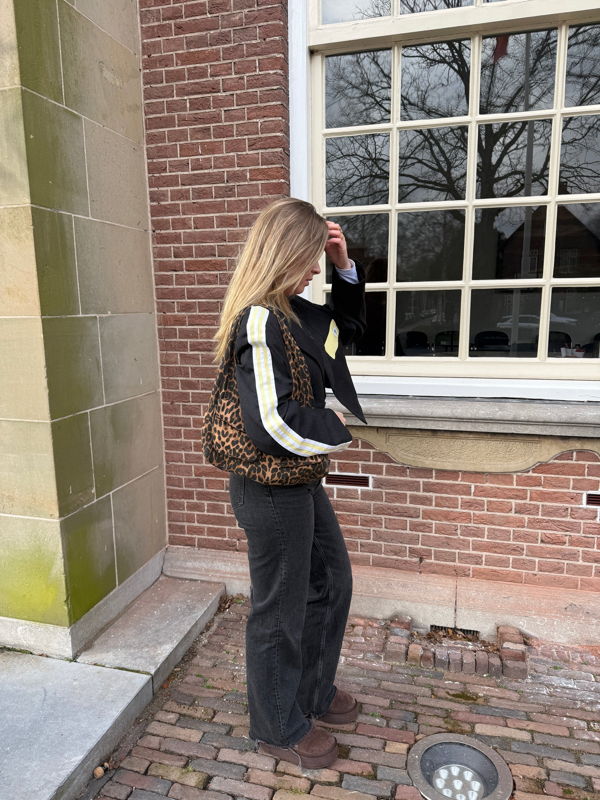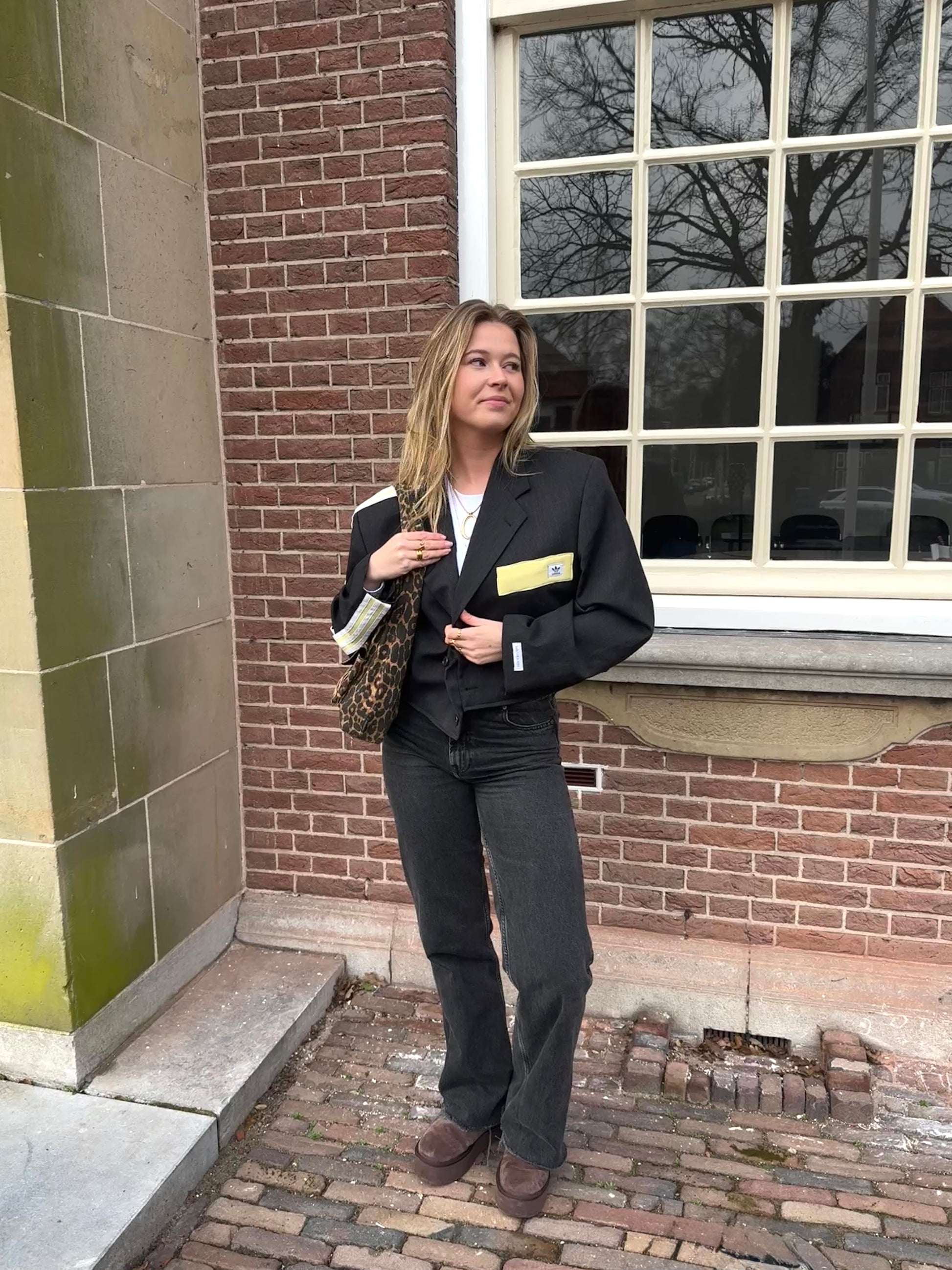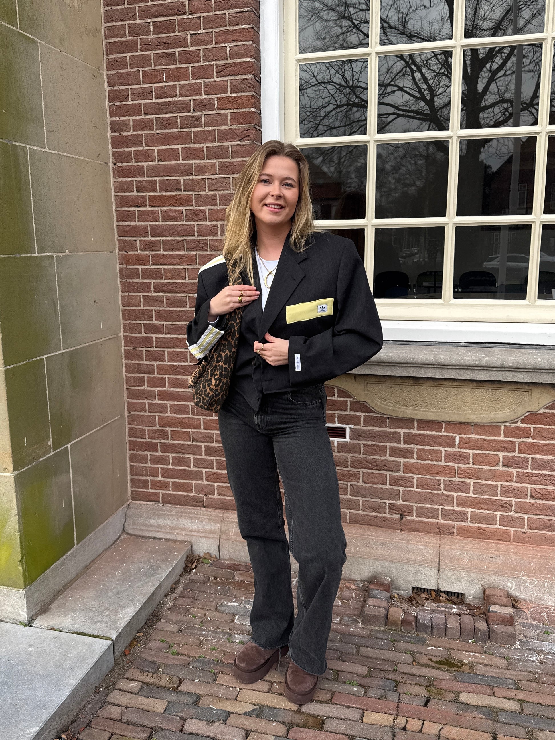 De blazers kunnen van maat XS t/m L. Heb je een maat L zal de blazer iets kleiner vallen dan het model en heb je een maat XS juist iets groter dan het model.